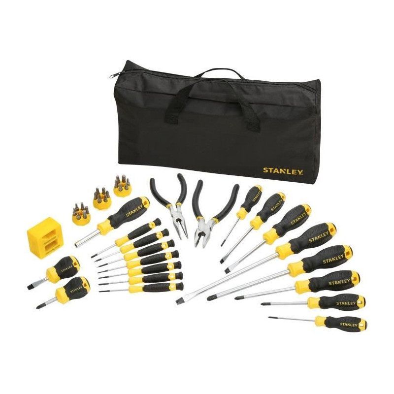 Doté d'une poignée souple, le jeu de tournevis STANLEY® en sac soupe de 39 pieces est conçu pour offrir un confort exceptionnel, en particulier lors de travaux professionnels répétitifs. Fabriqué en acier au chrome vanadium a haute résistance pour réduire le risque de rupture de l'embout, ce tournevis de haute qualité convient aux applications exigeantes a couple élevé. Le jeu de tournevis est conçu pour améliorer la rétention des vis, ainsi que la durabilité, la fiabilité et la durée de vie des produits. Le manche est moulé directement sur la barre pour une résistance accrue et une liaison pratiquement incassable. Et grâce a l'identification claire de l'embout sur le manche, vous pouvez facilement identifier le bon tournevis pour chaque tâche.