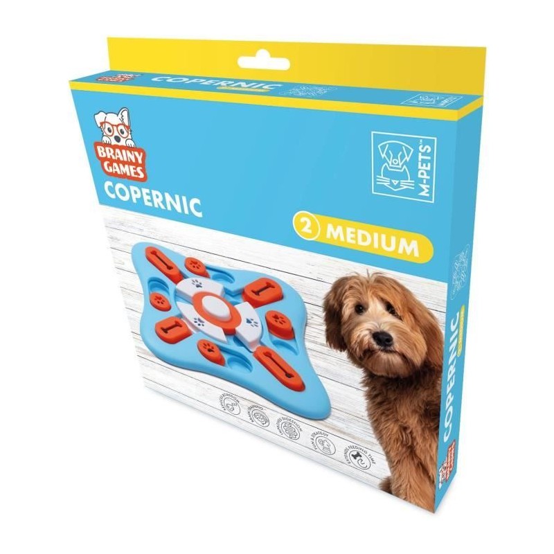 Niveau 2 - Moyen. Comprend 10 trous et 18 glissieres mobiles. 25 x 25 x 3 cm Réduit l'ennui. Entraînement cérébral. Améliore la digestion. Amusement et stratégie. Prolonge le temps d'alimentation. Antidérapant. La gamme M-PETS BRAINY GAMES offre une nouvelle façon amusante et savoureuse de tester le QI de votre chien et de l'entraîner. Les jeux sont disponibles en différents niveaux de difficulté, allant de Facile a Expert, et conviennent a tous les âges, tailles et races de chiens. Utilisez ces jeux éducatifs pour exercer le cerveau de votre animal, aider a améliorer ses instincts et entraîner son sens de l'odorat. Rendez les repas plus amusants en cachant de la nourriture a l'intérieur du jeu et en laissant votre chien utiliser son nez ou sa patte pour déplacer les glissieres. Chaque design a des mécanismes uniques, combinant différents trous et compartiments mobiles, qui nécessitent de la dextérité mentale et physique pour surmonter les défis et révéler des récompenses cachées telles que de la nourriture ou des friandises.. Niveau 2 - MOYEN. Votre animal doit apprendre a déplacer une forme a la fois pour obtenir de la nourriture ou des friandises. Ce jeu comporte des obstacles supplémentaires qui nécessitent que votre animal combine des actions pour atteindre la nourriture ou les friandises.