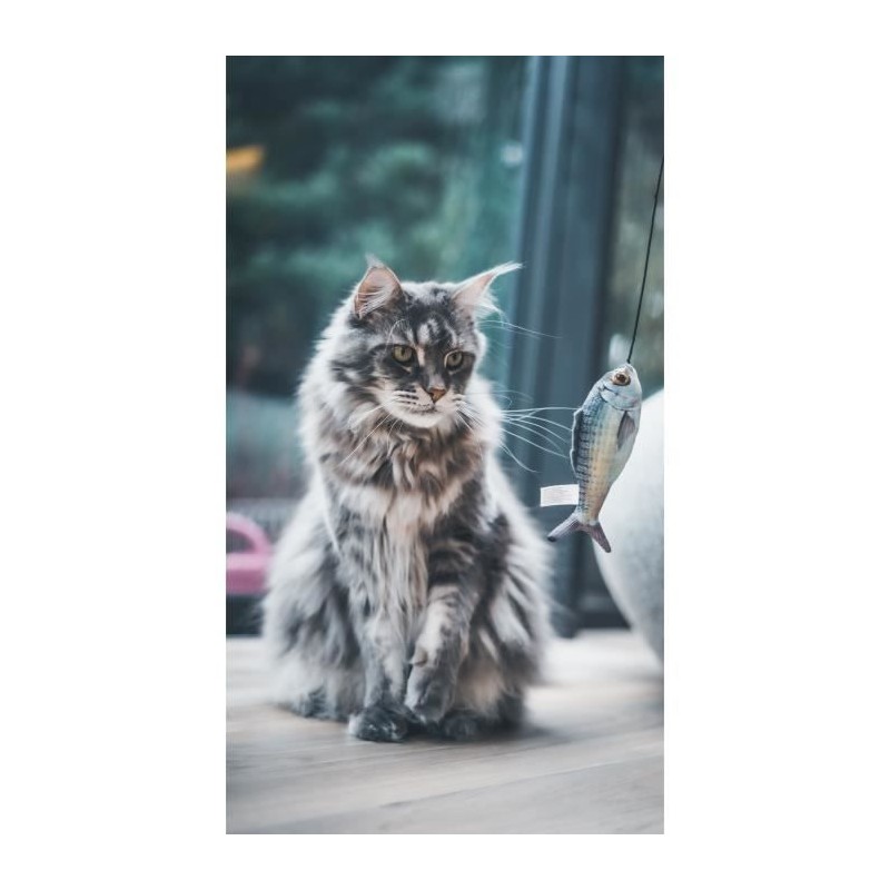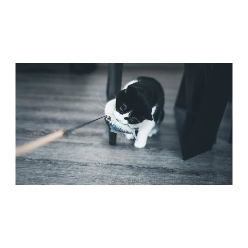 La canne a peche poisson AIMÉ est un jouet interactif pour chats. Composée d'un stick en bois et d'un poisson réaliste de 15 cm, elle integre du papier bruissant et de l'herbe a chat pour stimuler l'instinct de chasse. a faire glisser au sol ou suspendre, elle garantit des heures de jeu.