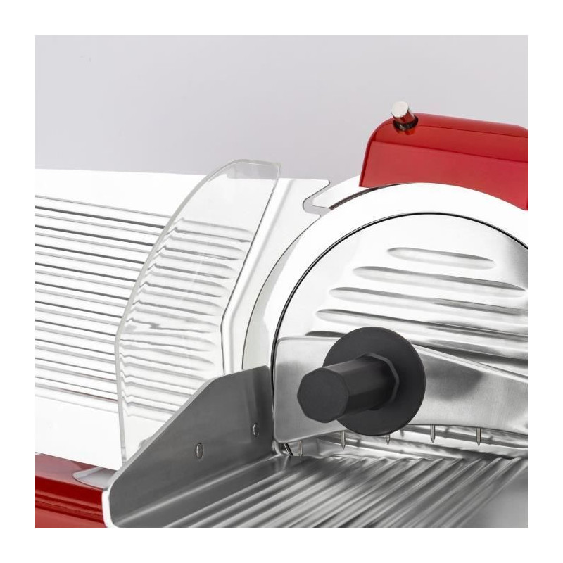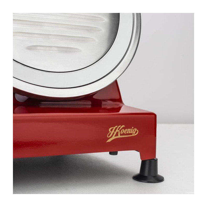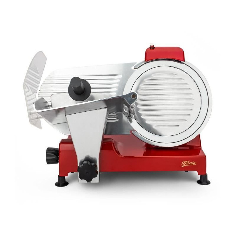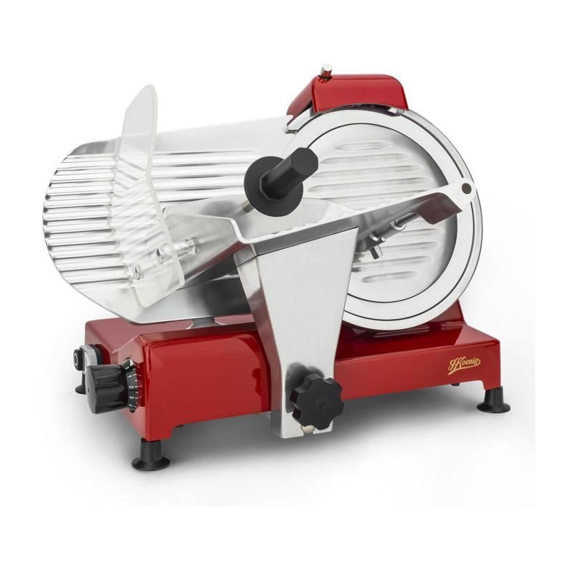 Trancheuse a viande - H.KoeNIG - MSX254 - Lame 25 cm. Dotée d'une lame italienne de haute qualité, vous pouvez trancher tous vos aliments a la perfection grâce a son diametre de 250 mm. Réglez la découpe (de 0 a 12 mm) pour adapter la trancheuse a vos besoins : chiffonnade de boeuf, tranche de pain, fruits, fromage... Puissante, rapide et silencieuse grâce a son moteur asynchrone de 240 watts et 282 tr/min. Pratique avec son aiguiseur de lame intégré pour un résultat optimal de coupe et son large plateau pour faciliter le positionnement d'un gros jambon. Ses 4 pieds antidérapants suppriment les risques de chute ou d'instabilité. Son design rouge s'intégrera parfaitement dans votre cuisine. La trancheuse a viande MSX254 : pour une découpe précise !