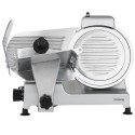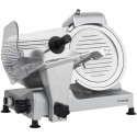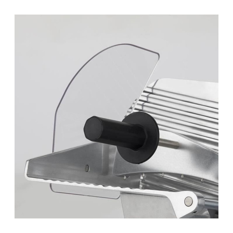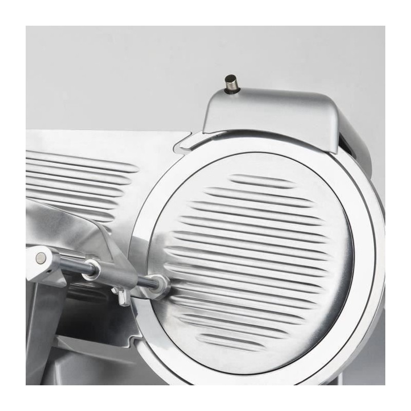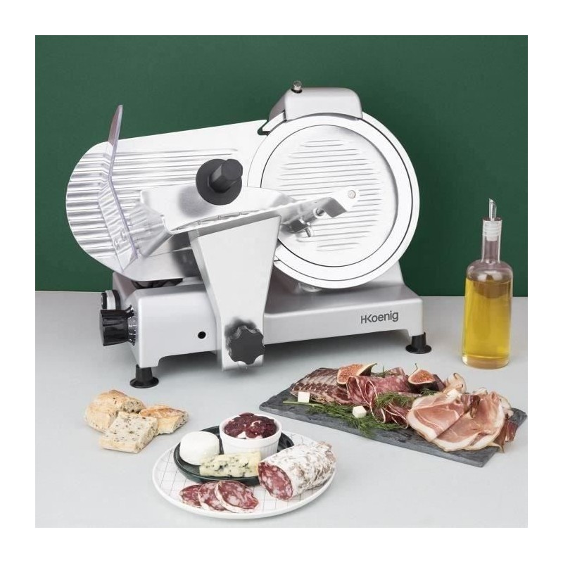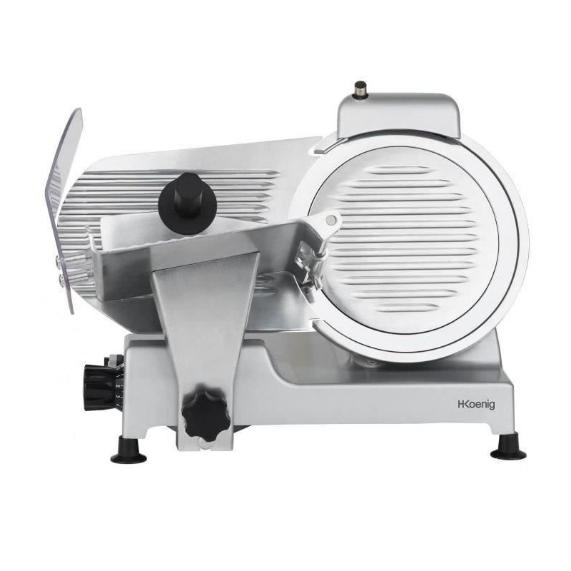 Trancheuse a viande - H.KoeNIG - MSX250 - Lame 25 cm. Dotée d'une lame italienne de haute qualité, vous pouvez trancher tous vos aliments a la perfection grâce a son diametre de 250 mm. Réglez la découpe (de 0 a 12 mm) pour adapter la trancheuse a vos besoins : chiffonnade de boeuf, tranche de pain, fruits, fromage... Puissante, rapide et silencieuse grâce a son moteur asynchrone de 240 watts et 282 tr/min. Pratique avec son aiguiseur de lame intégré pour un résultat optimal de coupe et son large plateau pour faciliter le positionnement d'un gros jambon. Ses 4 pieds antidérapants suppriment les risques de chute ou d'instabilité. Son design gris et métal s'intégrera parfaitement dans votre cuisine. La trancheuse a viande MSX250 : pour une découpe précis !