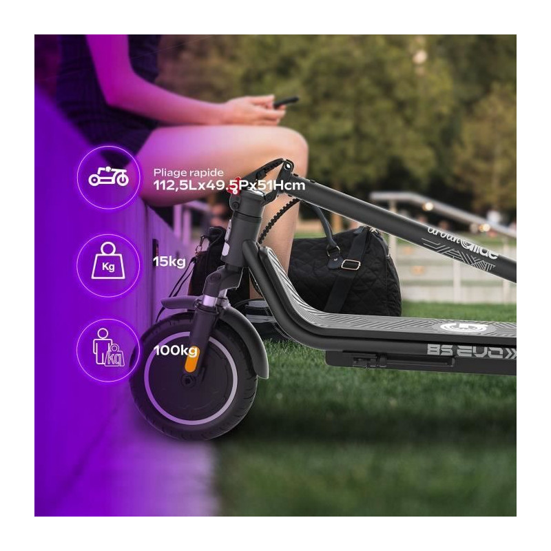 La trottinette électrique UrbanGlide Ride 85 EVO est une solution idéale pour les déplacements urbains quotidiens. Dotée d'un moteur de 300W en crete, elle atteint une vitesse maximale de 25 km/h et offre une autonomie jusqu'a 20 km grâce a sa batterie 21,6V / 7,8Ah . Ses pneus de 8,5 pouces et sa double suspension avant assurent une conduite confortable, tandis que le frein a disque arriere garantit un freinage efficace. Avec un poids de 15 kg et un systeme de pliage rapide, elle est facilement transportable. L'écran LED fournit des informations en temps réel, et les éclairages LED avec clignotants intégrés assurent une visibilité optimale. Elle supporte une charge maximale de 100 kg et est certifiée IPX5 pour la résistance a l'eau