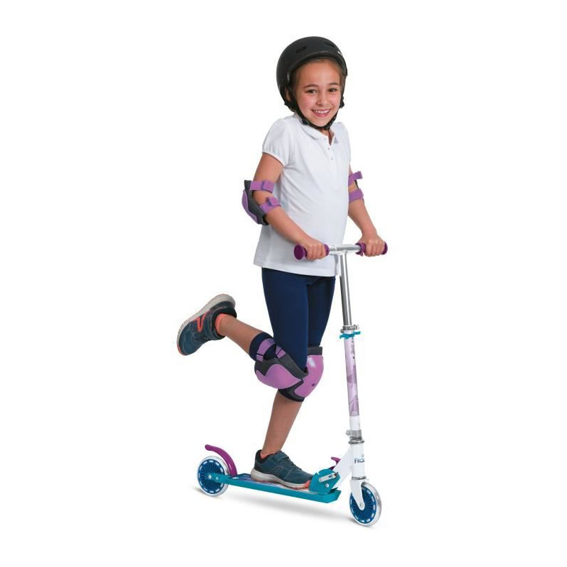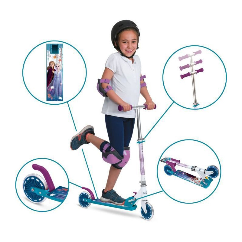 Trottinette 2 roues La Reine des Neiges. Deck aluminium antidérapant, roues PVC 12cm, roulements ABEC-5, guidon réglable, pliage rapide, 50kg maximum. Des 5 ans.