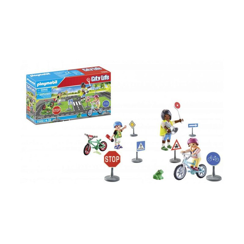 La classe de sécurité routiere PLAYMOBIL est un jeu éducatif pour les enfants de 4 ans et plus. Les éleves apprennent le sens de différents panneaux routiers ainsi que des feux de circulation afin qu'ils soient toujours en sécurité, a pied ou en vélo. Le coffret inclus trois personnages, six panneaux routiers, deux vélos, un mégaphone et d'autres accessoires.