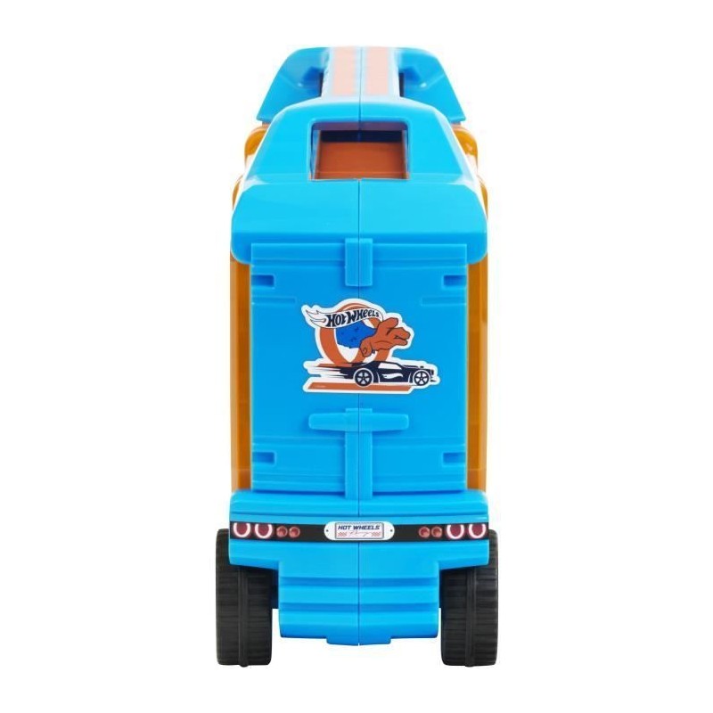 Offrez aux enfants une expérience de jeu unique grâce a ce grand et tres beau camion de transport de véhicules miniatures sous licence Hot Wheels ! Ce camion - qui se transforme en mallette facile a transporter grâce a sa poignée - est idéal pour ranger et/ou collectionner des voitures et des camions a l'échelle 1:24e. Il compte au total 24 compartiments pour voitures et 2 compartiments pour camions. Les enfants peuvent ainsi ranger soigneusement leurs véhicules apres avoir joué et les emmener partout avec eux. Ce camion n'est pas qu'une simple solution de rangement ou de transport, non. Les enfants peuvent aussi jouer et s'amuser avec de tres longues heures ! Ils peuvent par exemple utiliser la rampe qui part de l'arriere du camion et débouche par la calandre a l'avant pour réaliser des courses sensationnelles. Ce camion en plastique de tres grande qualité est aussi équipé de roues souples idéales pour jouer a l'intérieur - sans faire trop de bruit - comme a l'extérieur. Il est aussi livré avec des accessoires : 1 panneau d'arrivée, 2 cônes et 3 trophées. C'est LE cadeau idéal pour les amoureux de petites voitures Hot Wheels ! Dimensions hors emballage : 62,9 x 12 x 23,6 cm. Voitures non incluses. A partir de 3 ans.