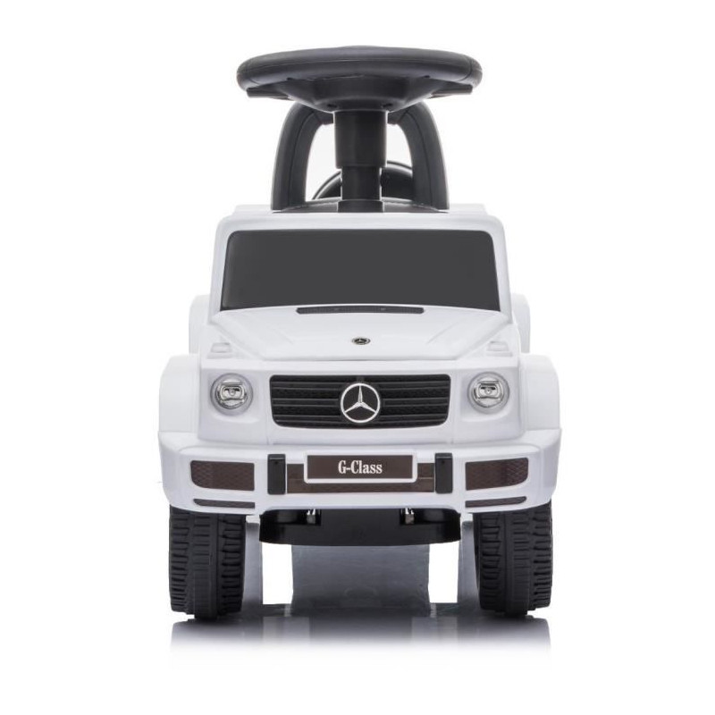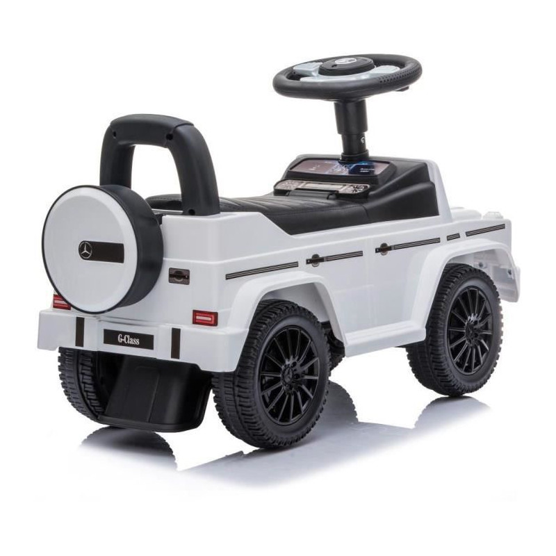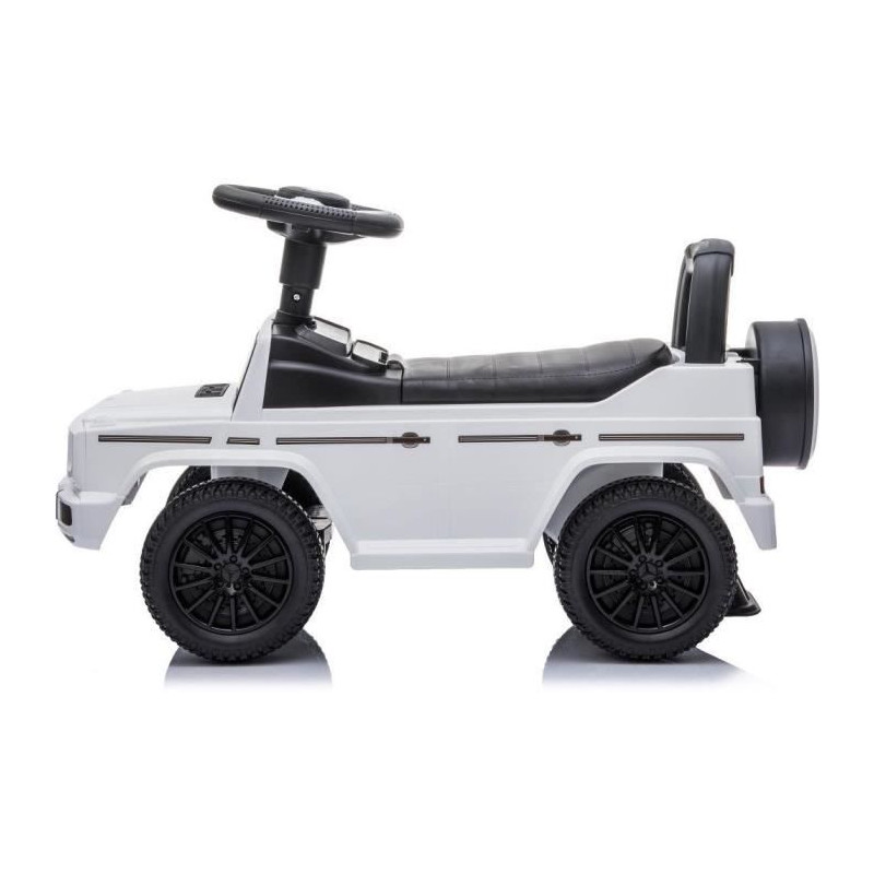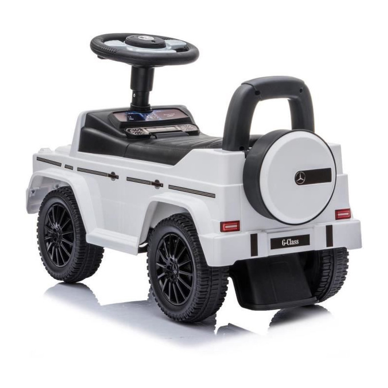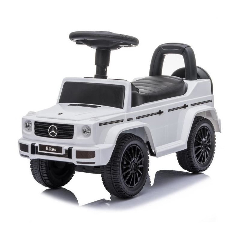 Découvrez le porteur enfant Mercedes G350d de Buddy Toys, modele BPC 5180. Ce porteur sous licence officielle offre un espace de rangement sous le siege, des sons et mélodies sur le volant, et convient aux enfants a partir de 2 ans. Capacité de charge de 25 kg, dimensions de 70 x 29 x 41 cm, couleur blanche. Piles non incluses.