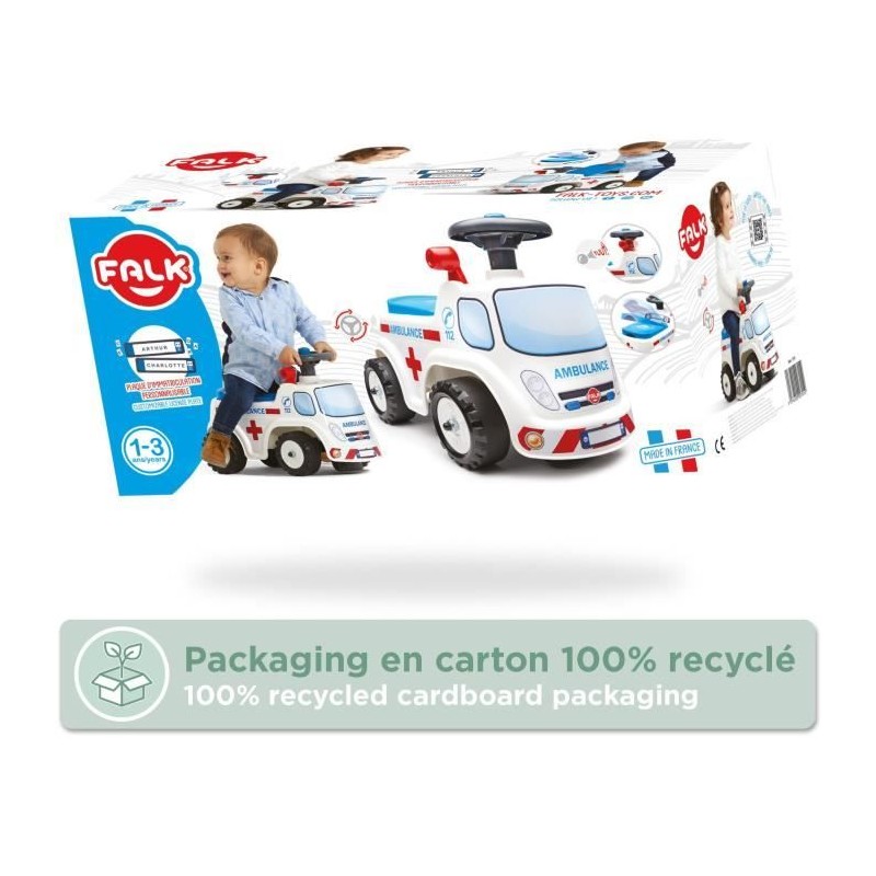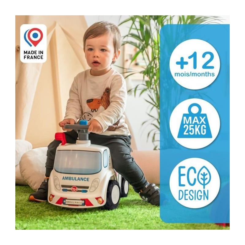 Doudou s'est tordu la cheville ? Il faut vite envoyer les secours ! Bébé accourt au volant de son ambulance 100% Fabriqué en France. Super maniable grâce a son volant directionnel avec klaxon, votre enfant n'aura aucune difficulté a manoeuvrer a travers la maison et avertir de son arrivée tout en développant sa motricité globale. Votre petit docteur en herbe pourra prendre soin d'emporter avec lui tout le nécessaire d'un vrai médecin grâce au coffre de rangement dissimulé sous l'assise. Et pour s'approprier totalement son bolide préféré, nous y avons ajouté une plaque d'immatriculation personnalisable, pour y écrire son prénom ou donner un surnom a cette petite ambulance pas comme les autres.