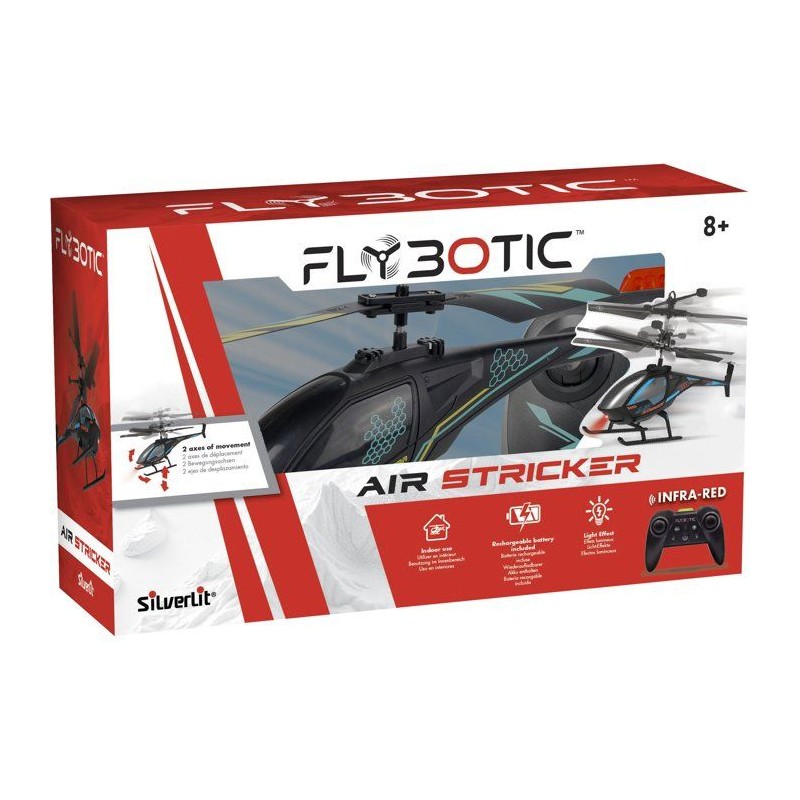 L'Air Striker de Flybotic est l'hélicoptere parfait pour s'initier au vol des 8 ans. Grâce a son vol stationnaire automatique, il est stable, simple a piloter et rassurant. Compact et léger, il vole jusqu'a 8 m pendant environ 5 minutes. Batterie rechargeable incluse. Un jouet idéal pour découvrir le pilotage aérien.