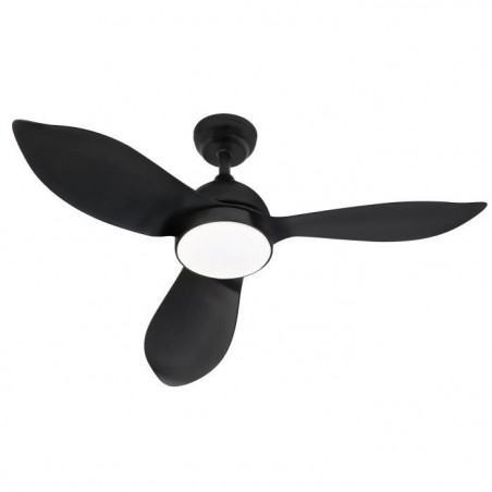 Ventilateur de plafond diametre 116cm, puissance 70W, 3 vitesses, plateau d'éclairage LED 1500Lm 18W avec réglage de la couleur lumineuse (2200K : jaune - 4000K : naturel - 6500K : blanc) et de l'intensité de lumiere, 3 pales plastique blanches, bloc moteur et cabochon en métal blanc. Télécommande founie (piles non incluses). Rotation réversible pour une bonne circulation de l'air en été comme en hiver. En été l'air